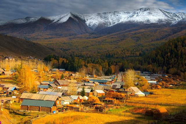 村子里的房屋,大多是樸素的木頭房,分布在溝谷底,金黃色的樺樹和楊樹點(diǎn)綴,還有兩條清澈的小河環(huán)村流過(guò)。