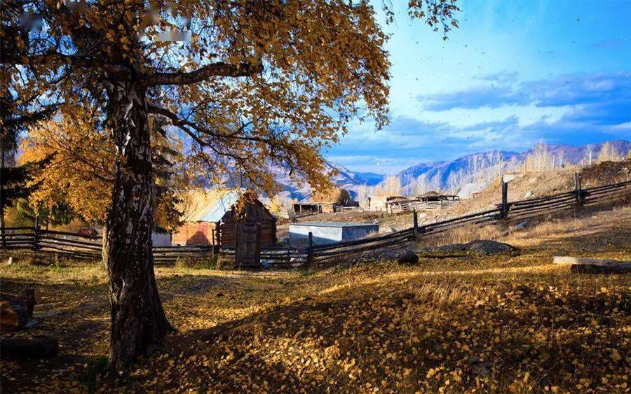 藍(lán)色的天、雪白的山峰、金黃的楊樹(shù)葉、火紅的樺樹(shù)葉,