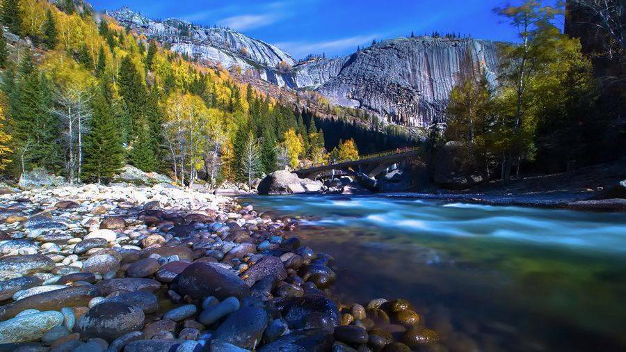 山間金黃的白樺樹(shù)、蔥綠的針葉樹(shù)在藍(lán)天白云的映照下,層層疊疊,色彩斑斕,是金秋喀納斯一幅雋永的油畫(huà)。
