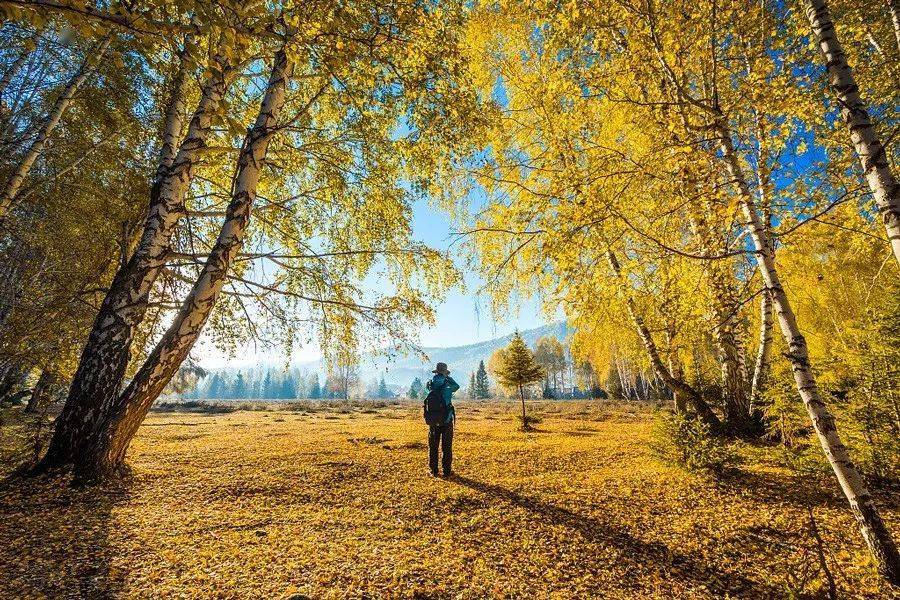 漫步在金色油畫(huà)廊白樺林,