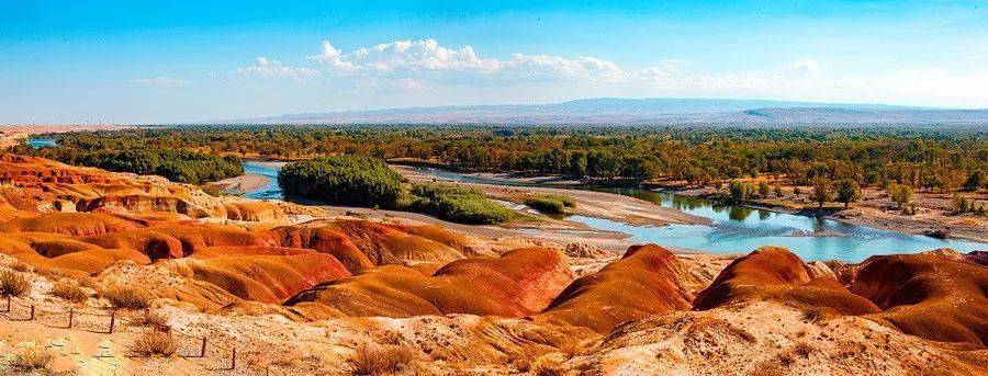 一岸碧水綠樹(shù)溫潤(rùn),一岸是懸崖式雅丹地貌火熱。