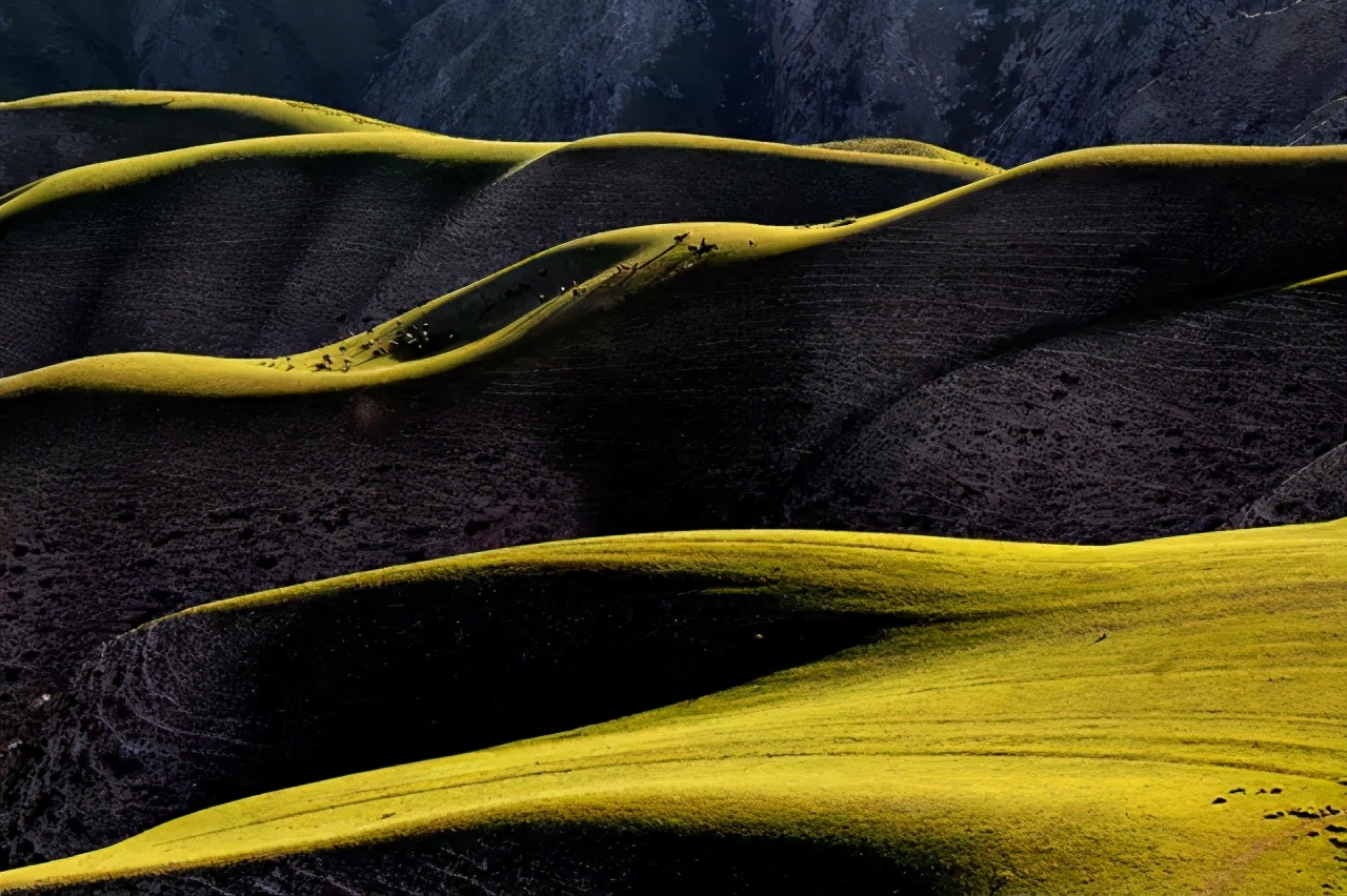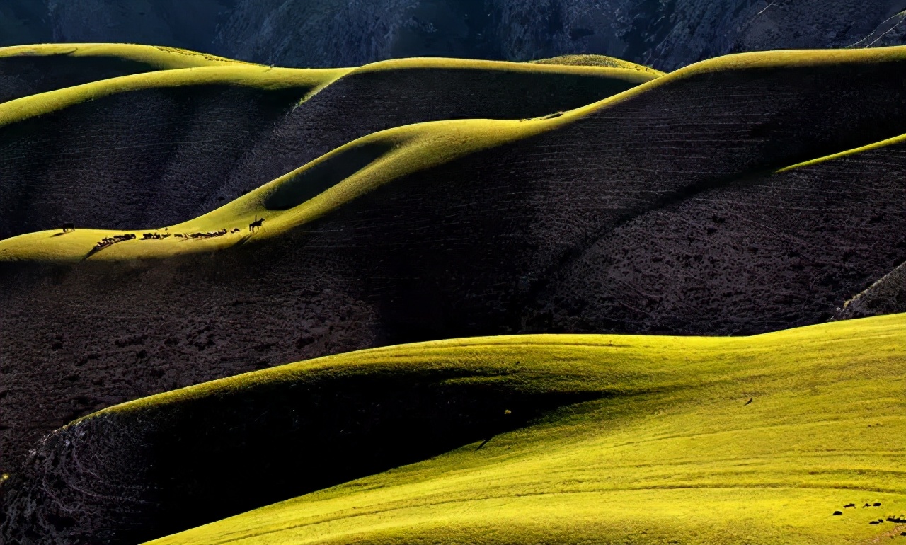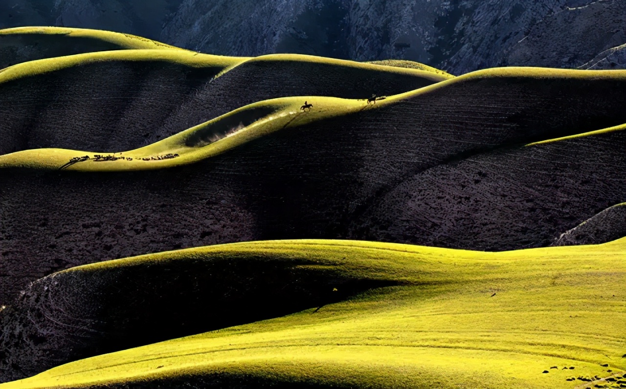 你以為這樣的喀拉峻已經(jīng)足夠美,不不,這些其他草原也有,不足為奇,下面才是獨(dú)一無二的驚艷!群山起伏成極富韻律的曲線,如大海掀起的層層波浪,為茫茫草原平添一份奇特動感的美,只一眼就震撼到失了言語。