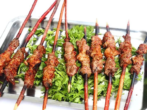 傳統(tǒng)紅柳枝烤羊肉串與普通羊肉串大不相同。在新疆隨處都長(zhǎng)著紅柳樹(shù),于是當(dāng)?shù)厝司偷厝〔模眉t柳的樹(shù)枝削成木簽來(lái)烤羊肉串。