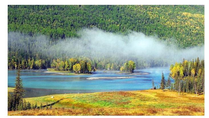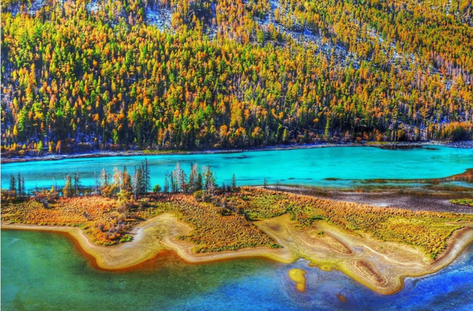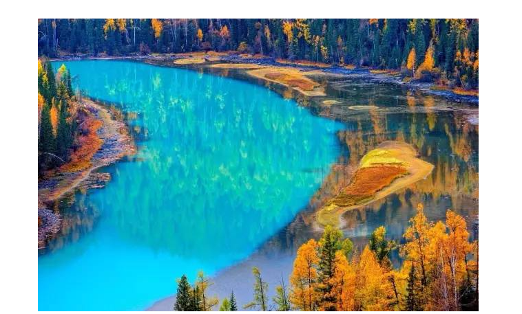喀納斯湖水變換著各種美妙的顏色,寶石般的湖藍(lán)色,亦或是金黃色、淡綠色、銀白色、橙紅色,什么顏色照到了這面鏡子里,它就變化成什么顏色。秋天的色彩更是豐富,白樺林銀白的樹干、金黃的葉子,其中夾雜著翠綠的松柏,天空是湛藍(lán)湛藍(lán)的。