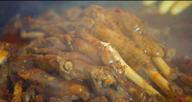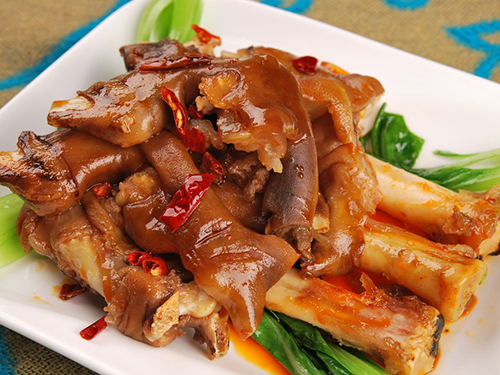 3、羊蹄入老湯鍋燉爛(指蹄筋)后入盤,把羊蹄鹵到熟爛,羊蹄本身沒有什么肉,就是一層皮,要小心不要過爛,導致骨肉分離的悲慘下場。鹵好后,撈出,用胡椒、辣面等佐料拌勻即可,或者可以淋一些剛才的鹵湯汁。