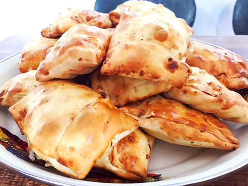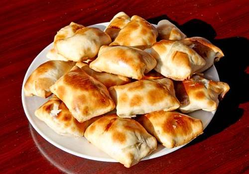 烤包子(維語叫“撒木薩”)和薄皮包子(維語叫“皮特爾曼它”)是維吾爾族同胞喜愛的食品之一。城鄉(xiāng)巴扎的飯館、食攤多銷售這種食品??景又饕窃阝慰涌局啤0悠び盟烂鎿{薄,四邊折合成方形。包子餡用羊肉丁、羊尾巴油丁、洋蔥、孜然粉、精鹽和胡椒粉等原料,加入少量水,拌勻而成。把包好的生包子貼在馕坑里,十幾分鐘即可烤熟,皮色黃亮,入口皮脆肉嫩,味鮮油香。