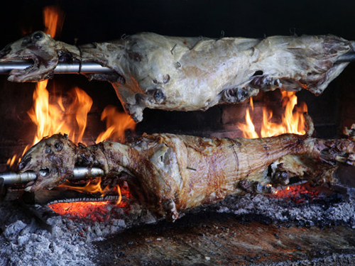烤全羊是維吾爾族的一大傳統(tǒng)名肴。在烏魯木齊、喀什、和田等地的巴扎爾都可聞到它特有的香味??救虿粌H是街頭的風(fēng)味小吃,而且也是維吾爾人招待貴客的上等佳肴,現(xiàn)在也成為高級筵席中的一道佳品,倍受中外客人的青睞??救蚴切陆蠲F的菜肴之一,之所以如此馳名,除了它選料考究外,就是它別具特色的制法。新疆羊肉質(zhì)地鮮嫩無膻味,在國際國內(nèi)肉食市場上享有盛譽??救蚨噙x用綿羯羊或周歲以內(nèi)的肥羊羔為主要原料,這樣的羊,肉不僅嫩而且營養(yǎng)價值高,嚼在嘴里滿口香。這是維吾爾人在長期食用羊肉的日常生活中總結(jié)出來的寶貴經(jīng)驗。宰殺剝皮、去頭、蹄和內(nèi)臟后,用一頭釘有大鐵釘?shù)哪竟?,將羊從頭至尾穿上。再用蛋黃、鹽水、姜黃、孜然粉、胡椒粉、白面粉等調(diào)成糊狀的汁子抹在羊的全身,然后把羊頭部朝下地放入熾熱的馕坑,蓋嚴(yán)坑口,并不時地轉(zhuǎn)動木棍觀察,燜烤1小時左右即成??救蛏珴牲S亮,皮脆肉嫩,鮮香異常,全羊烤成后即放置餐車上,烹制者在羊頭上挽系紅彩綢,打成花結(jié),羊嘴放置香菜或芹菜。餐車備有小刀,服務(wù)人員推車圍繞餐桌轉(zhuǎn)動,恭請客人啟刀食肉。烤全羊色澤黃亮,皮脆肉嫩,鮮香異常,是維吾爾族人民招待貴賓的佳品。也使全羊成為了一件賞心悅目的藝術(shù)品。在南疆和田、且末等城鎮(zhèn)巴扎上,設(shè)有現(xiàn)烤現(xiàn)賣的烤全羊攤檔,專門剁塊零賣。